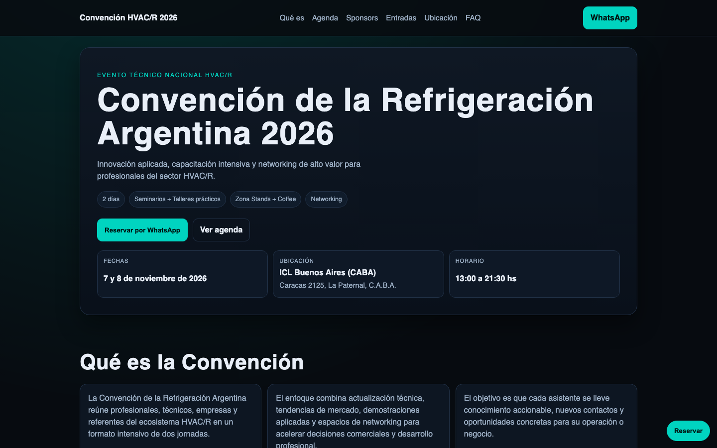 El evento HVAC/R más grande de Argentina. Portal con programa de 2 jornadas, venta de entradas online y zona de sponsors para nov 2026.