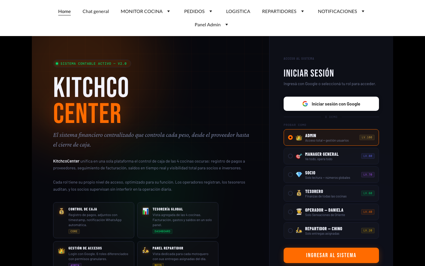 Panel operativo para dark kitchens que gestiona múltiples cocinas, 10+ repartidores y pedidos en tiempo real desde un solo dashboard.