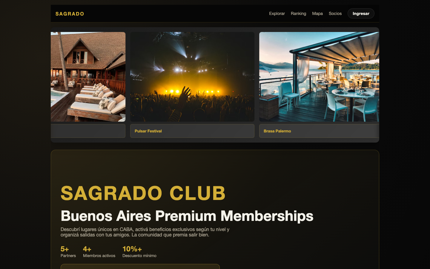 App de membresías premium en Buenos Aires. 4 niveles con QR, beneficios en partners exclusivos y organización de salidas grupales.